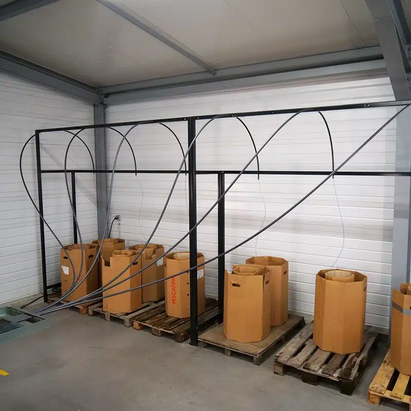 Floor-mounted reeling gantry to support the various tubes for the passage of electrical wires. The gantry is a mechanically welded steel assembly, assembled and erected by Mecaspin teams.